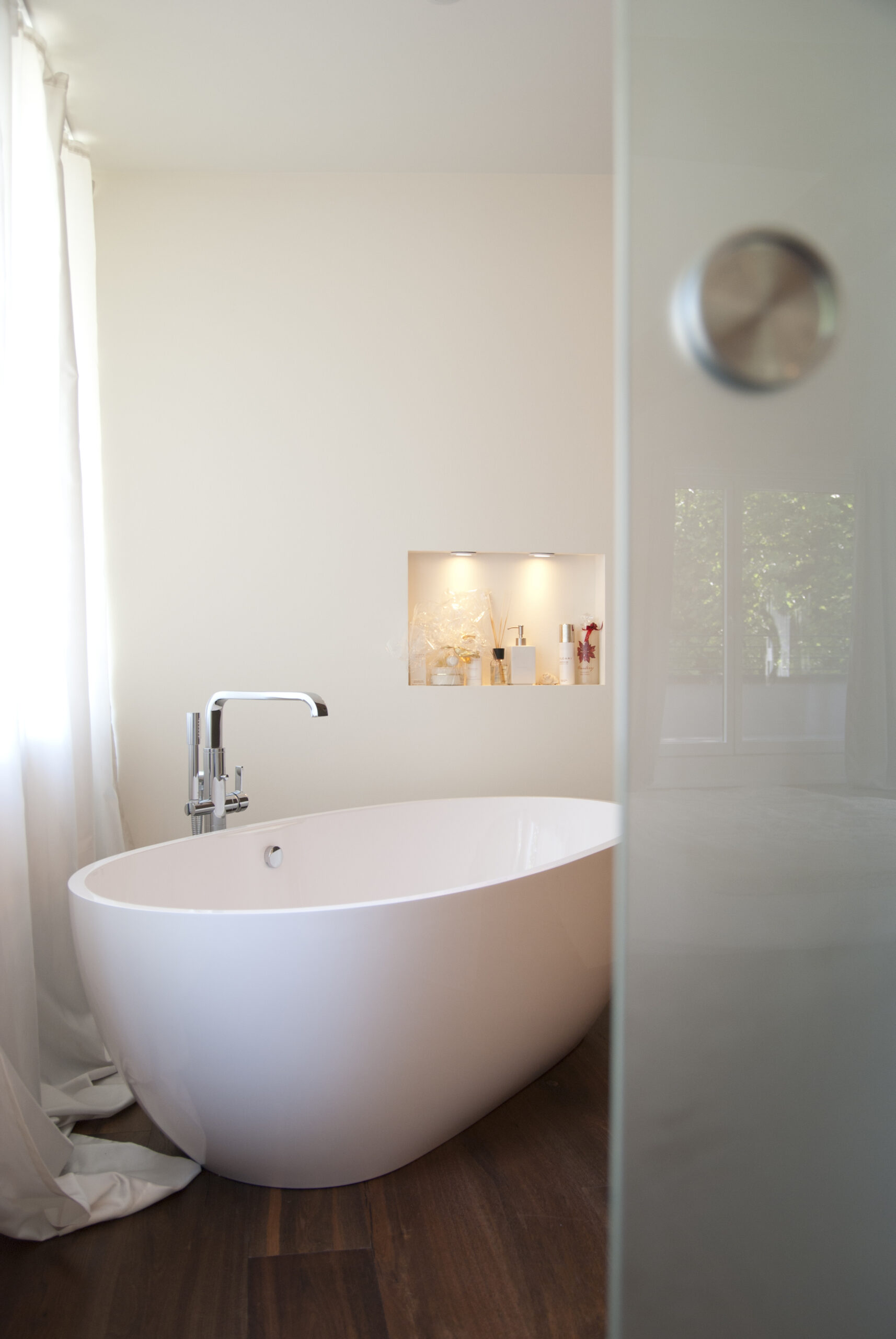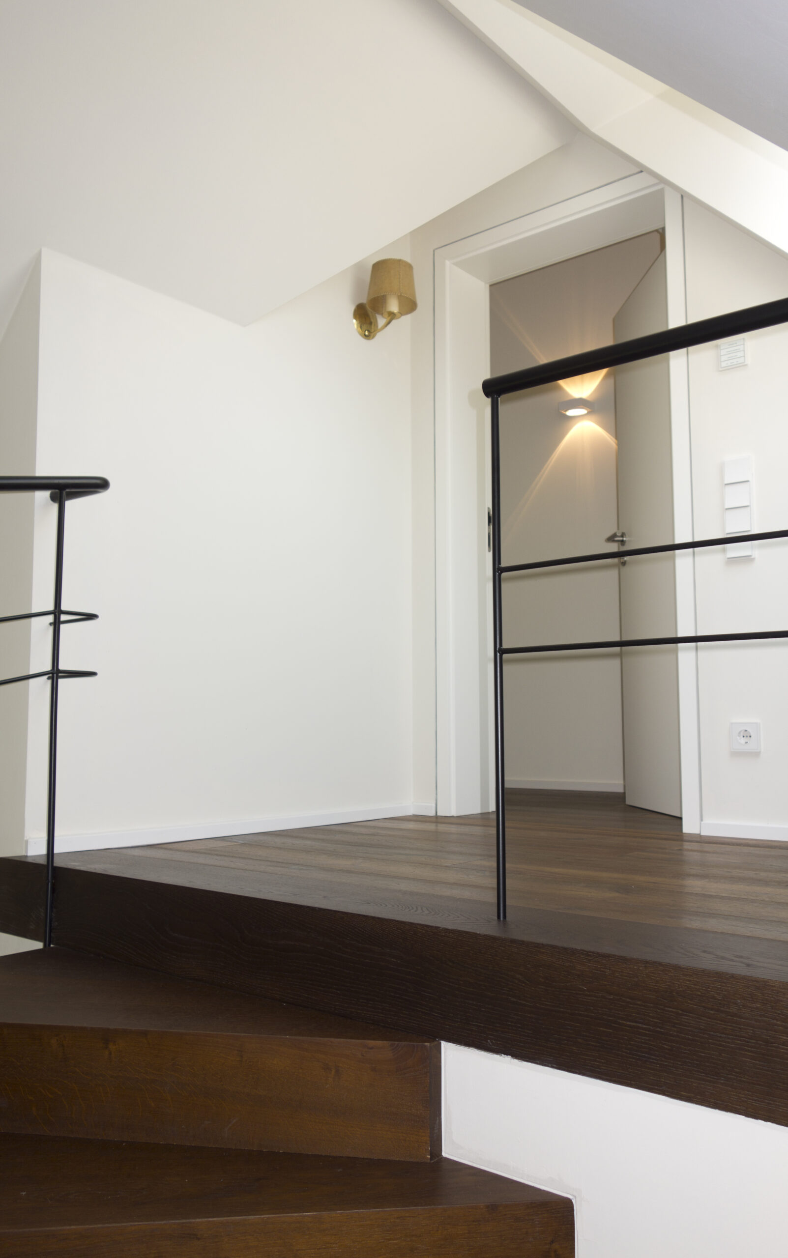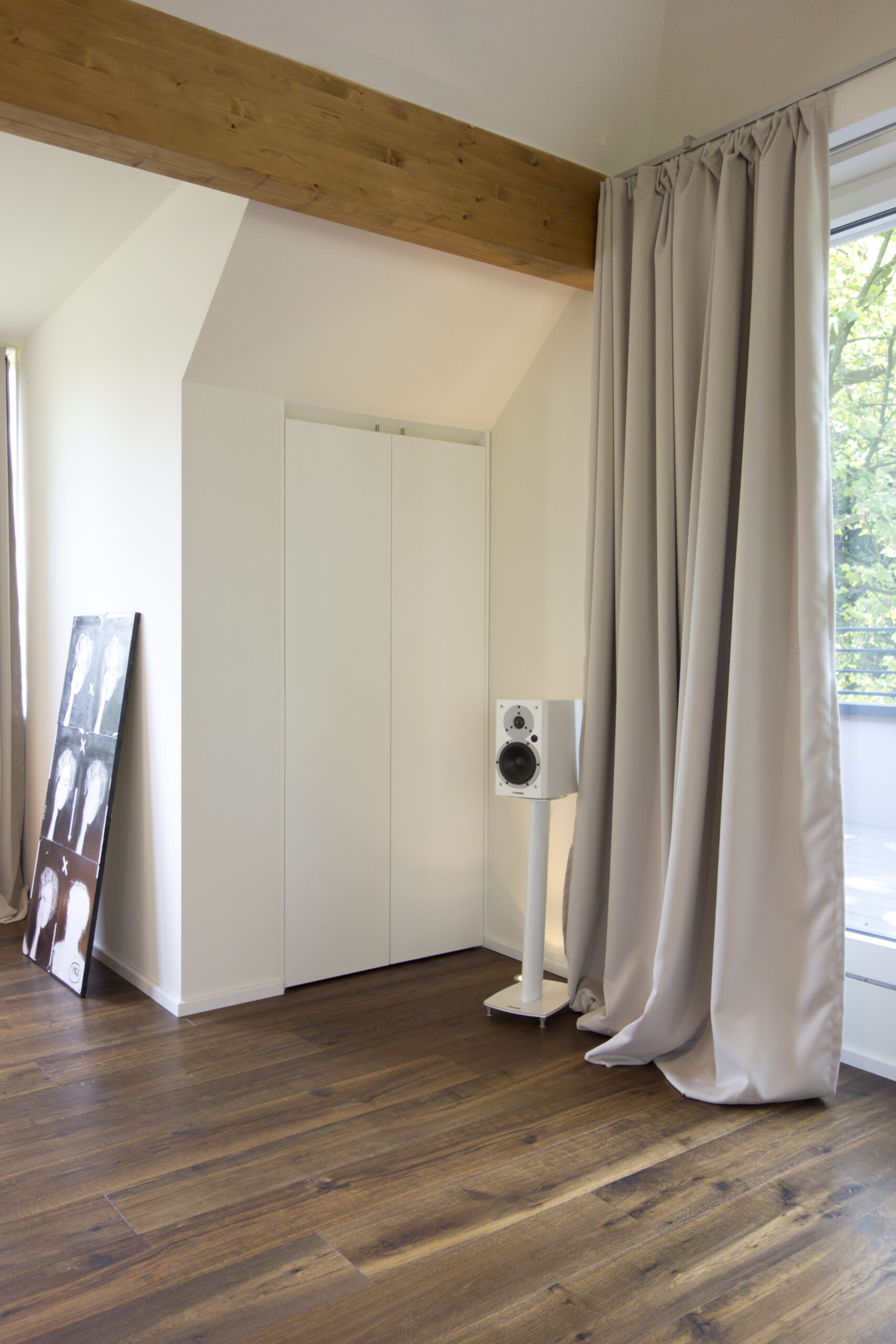 Der Ausbau des Dachgeschosses eines Einfamilienhauses im klassischen Stil der zwanziger Jahre machte es erforderlich, den alten Dachstuhl komplett abzutragen und durch einen neuen zu ersetzen. Dabei wurde besonderer Wert daraufgelegt, ihn in seiner ursprünglichen Form und Gestaltung wiederaufzubauen. So entstand ein großzügiger Wohn-Schlaf-Raum, ein Badezimmer mit ebenerdiger Dusche und ein separates WC. Die beidseitig angeordneten Gauben mit einer durchgehenden Verglasung stellen eine Beziehung zwischen dem umliegenden alten Baumbestand und dem Innenraum her. Ein Dachbalkon rundet den Ausbau ab.